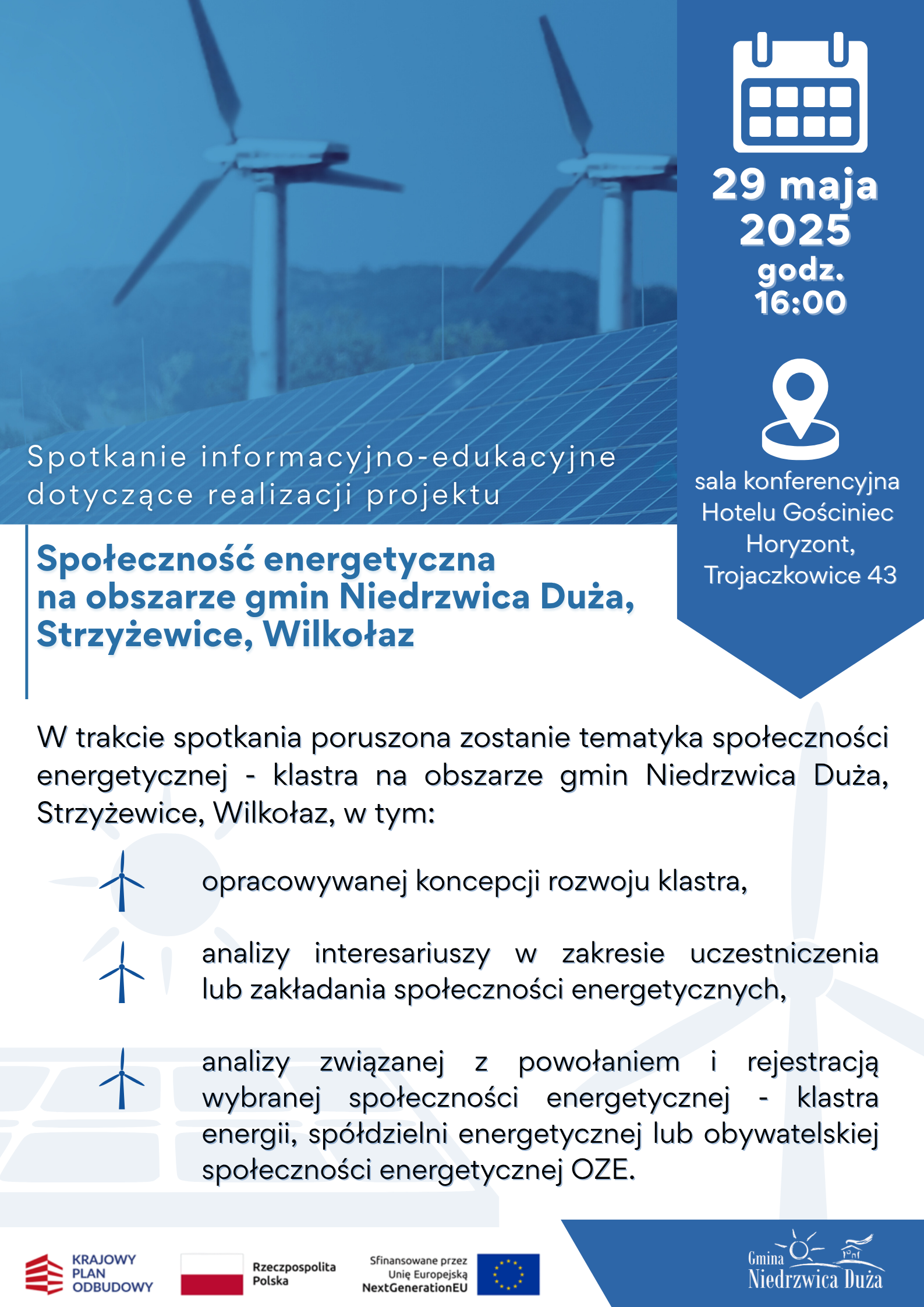 Spotkanie informacyjno-edukacyjne dotyczące realizacji projektu "Społeczność energetyczna na obszarze gmin Niedrzwica Duża, Strzyżewice, Wilkołaz"