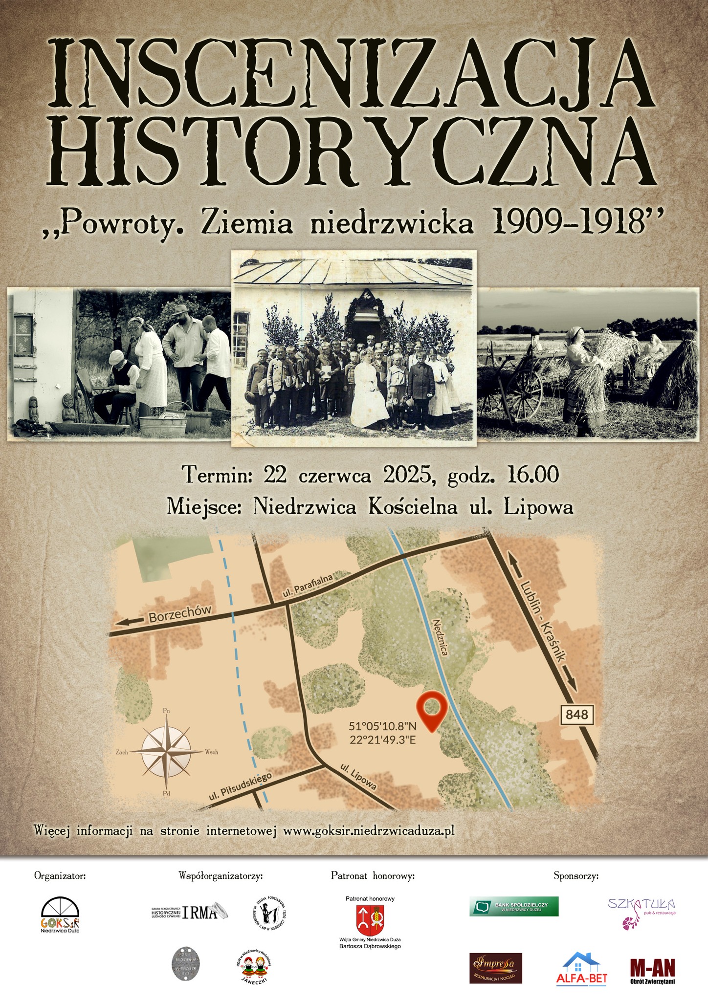 Gmina Niedrzwica Duża serdecznie zaprasza na wyjątkowe wydarzenie plenerowe – inscenizację historyczną pt. „Powroty. Ziemia niedrzwicka 1909–1918”, która odbędzie się 22 czerwca 2025 r. (niedziela) o godz. 16:00 przy ul. Lipowej w Niedrzwicy Kościelnej (mapka dostępna na plakacie promującym wydarzenie; na miejsce inscenizacji prowadzić będą oznaczone drogowskazy).
