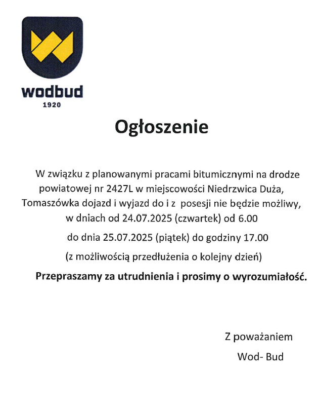 WAŻNE!!! Informacja firmy Wod-Bud o utrudnieniach w dojeździe do posesjiArchiwum
