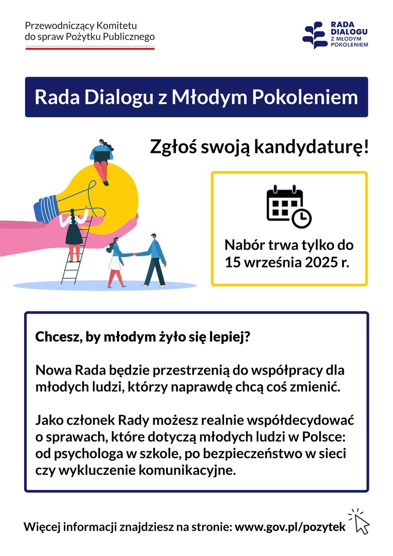 https://www.gov.pl/web/pozytek/przedluzenie-naboru-do-rady-dialogu-z-mlodym-pokoleniem-do-15-wrzesnia-2025-r - Treść ogłoszenia i wzory dokumentów: