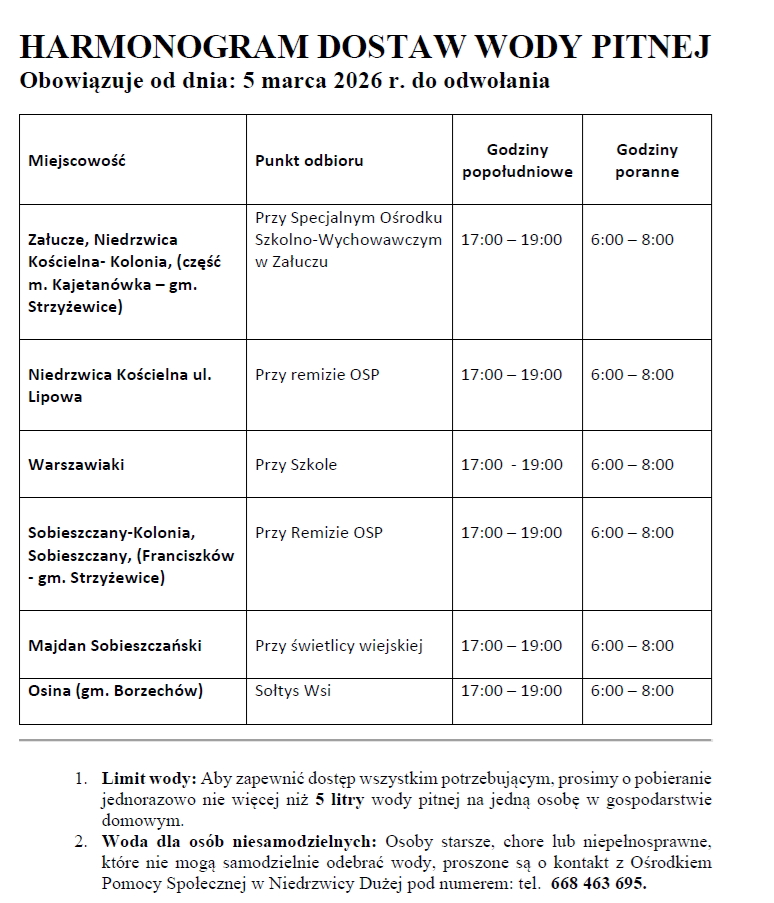 Harmonogram dostaw wody pitnejW związku z czasowym brakiem przydatności wody do spożycia przedstawiamy harmonogram dystrybucji wody pitnej dla miejscowości objętych zanieczyszczeniem bakteryjnym sieci wodociągowej.
