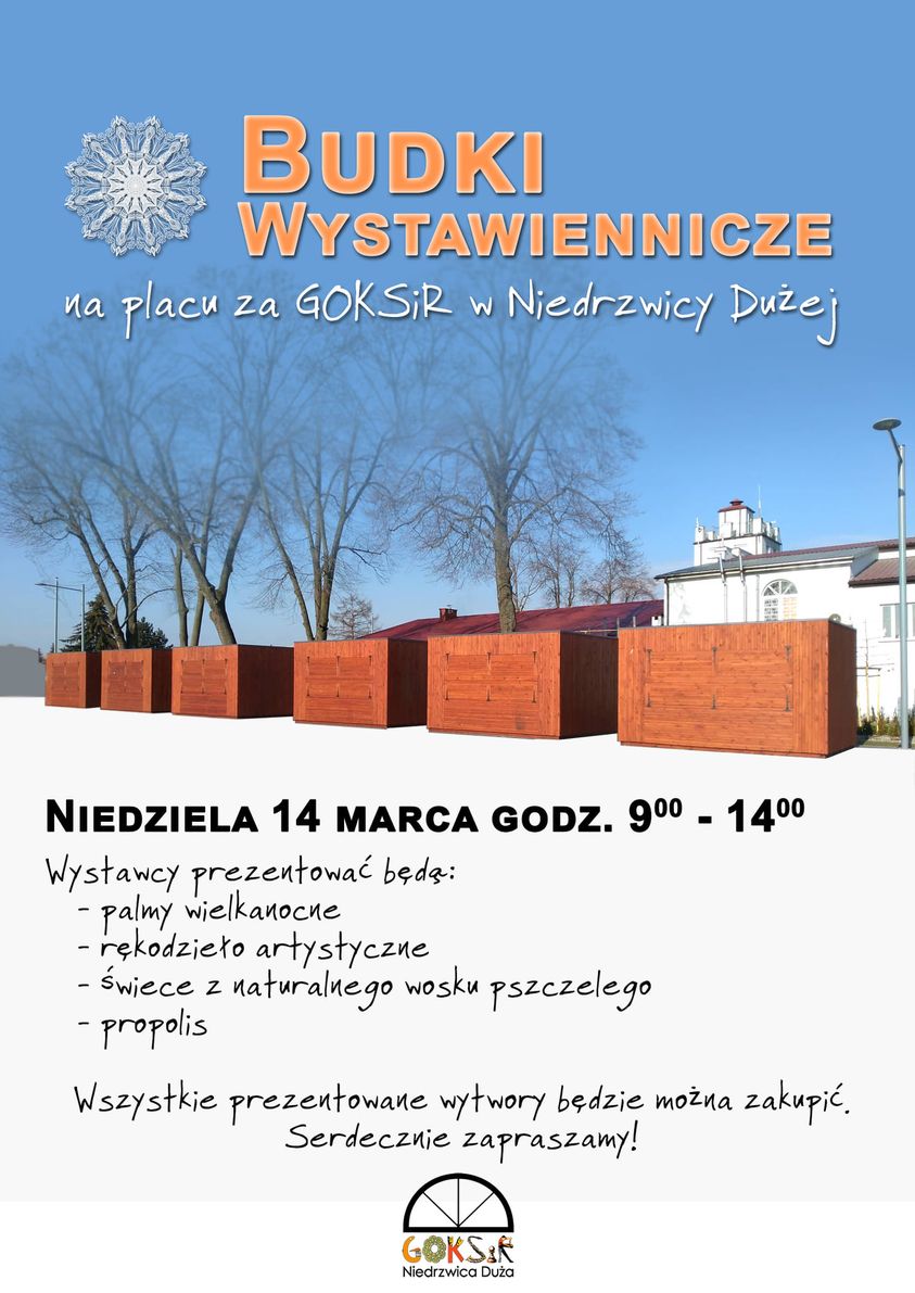 - 14 marca (niedziela), godz. 9:00 - 14:00 - Rękodzieło w budkach wystawienniczych - rękodzieło artystyczne, świece z naturalnego wosku, palmy wielkanocne, propolis.