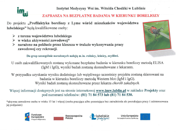 Instytut Medycyny Wsi im. Witolda Chodźki w Lublinie zaprasza na bezpłatne badania w kierunku boreliozy