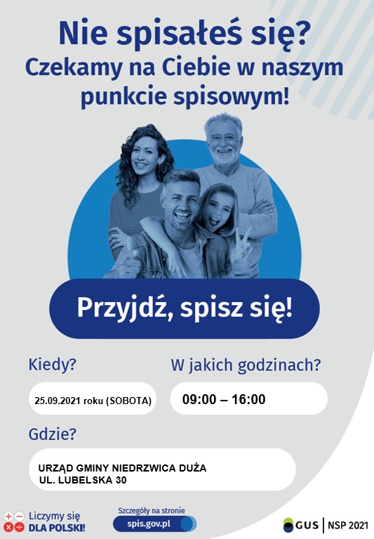 W związku ze zbliżającym się końcem Narodowego Spisu Powszechnego Ludności i Mieszkań informujemy, że w sobotę 25 września 2021 roku, w godz. 9:00 – 16:00 będzie otwarte Gminne Biuro Spisowe w Urzędzie Gminy Niedrzwica Duża w celu wypełnienia obowiązku spisowego.