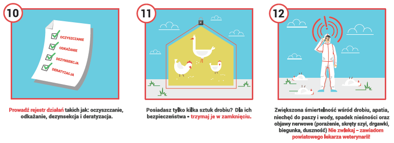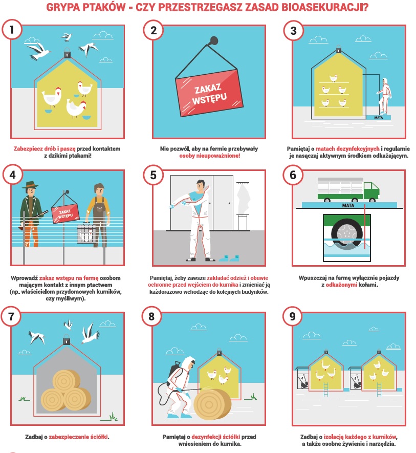W związku z bardzo poważną sytuacją związaną z kolejnymi stwierdzanymi przypadkami HPAI na terenie Polski, przedstawiamy 12 zasad bioasekuracji, zmniejszających ryzyko wystąpienia grypy ptaków i wzmożenia środków bezpieczeństwa w gospodarstwach utrzymujących drób.