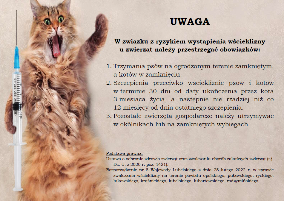 Informujemy, że 25 lutego 2022 roku ukazało się Rozporządzenie Wojewody Lubelskiego w sprawie zwalczania wścieklizny na terenie powiatu opolskiego, puławskiego, ryckiego, łukowskiego, kraśnickiego, lubartowskiego, radzyńskiego. W rozporządzeniu określono nakazy dotyczące powiatu lubelskiego: