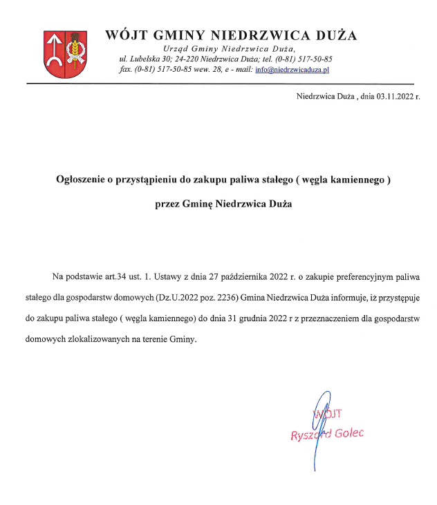 Ogłoszenie o przystąpieniu do zakupu paliwa stałego (węgla kamiennego) przez Gminę Niedrzwica Duża