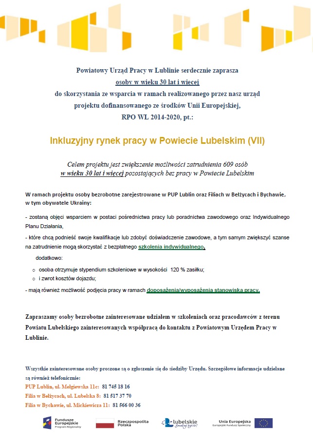 Powiatowy Urząd Pracy w Lublinie informuje o realizacji projektu pt. „Inkluzyjny rynek pracy w Powiecie Lubelskim (VII)” w ramach RPO WL 2014-2020. Projekt skierowany jest do osób powyżej 30 roku życia. Szczegóły w ulotce poniżej.