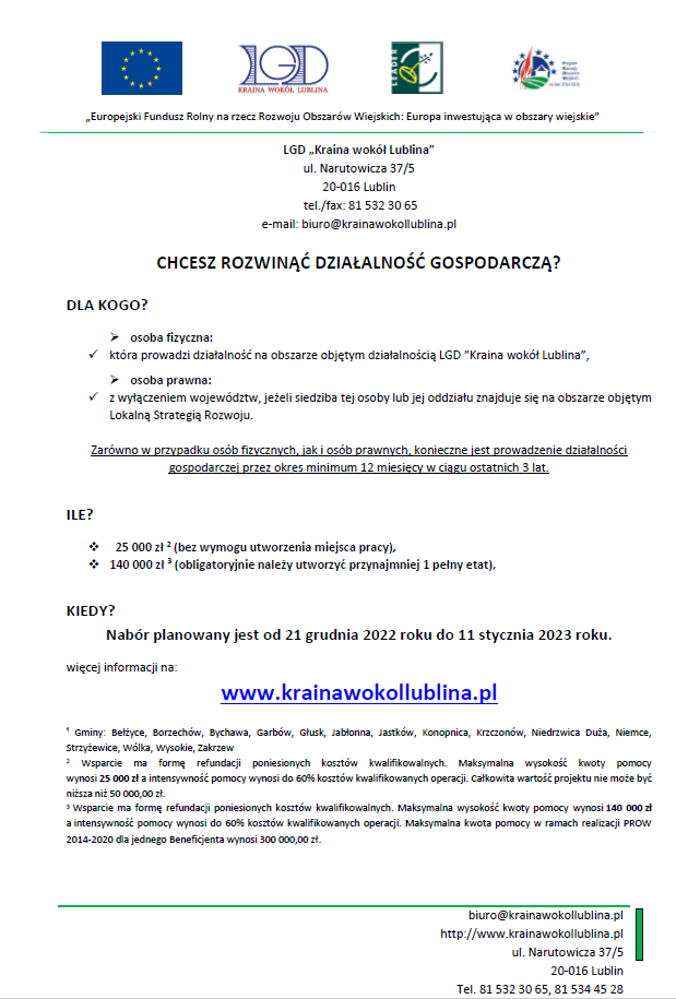 Informacja o planowanych naborach wniosków o przyznanie pomocy na rozwój działalności gospodarczejArchiwum