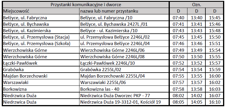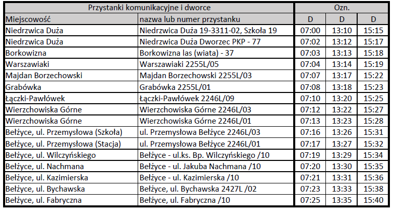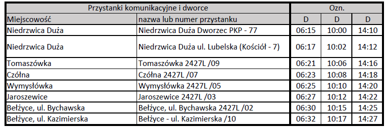 Informujemy, że od dnia 2 października 2023 r. obowiązywać będą nowe rozkłady jazdy komunikacji publicznej na trasie Niedrzwica Duża – Czółna – Bełżyce oraz Niedrzwica Duża – Łączki-Pawłówek - Bełżyce.