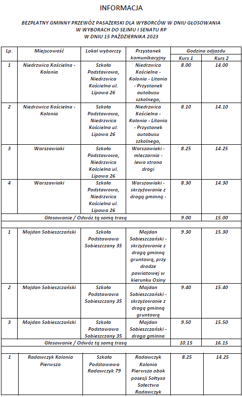 Wójt Gminy Niedrzwica Duża informuje, że w dniu wyborów do Sejmu i Senatu RP zarządzonych na dzień 15 października 2023 r. będzie można skorzystać z bezpłatnego przewozu pasażerskiego. Poniżej udostępniamy rozkład jazdy: