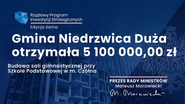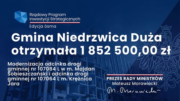 Informujemy, że Gmina Niedrzwica Duża w ramach 8. edycji Rządowego Programu Inwestycji Strategicznych Polski Ład otrzyma dofinansowania na realizację inwestycji w zakresie modernizacji dróg i budowy infrastruktury sportowej.