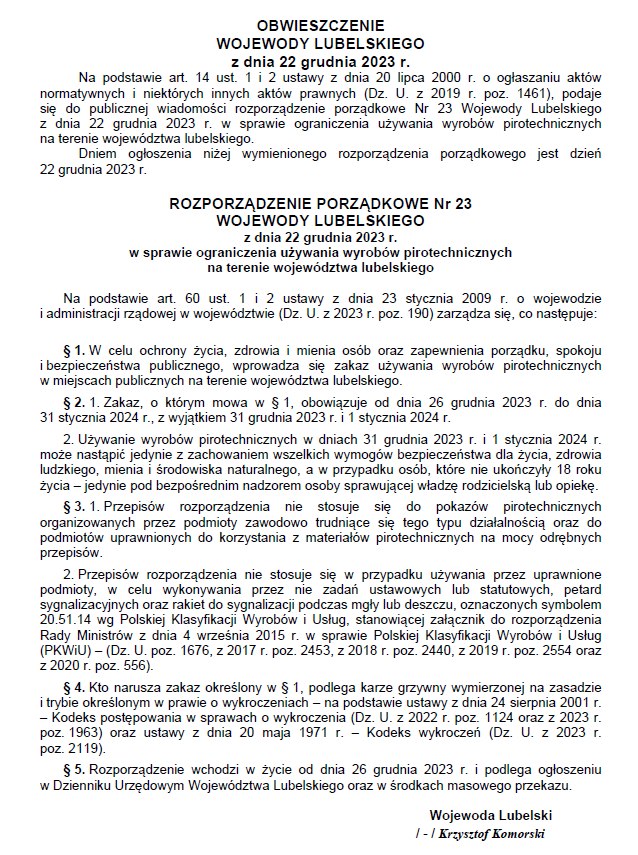 ROZPORZĄDZENIE WOJEWODY LUBELSKIEGO W SPRAWIE OGRANICZENIA UŻYWANIA WYROBÓW PIROTECHNICZNYCH NA TERENIE WOJEWÓDZTWA LUBELSKIEGO