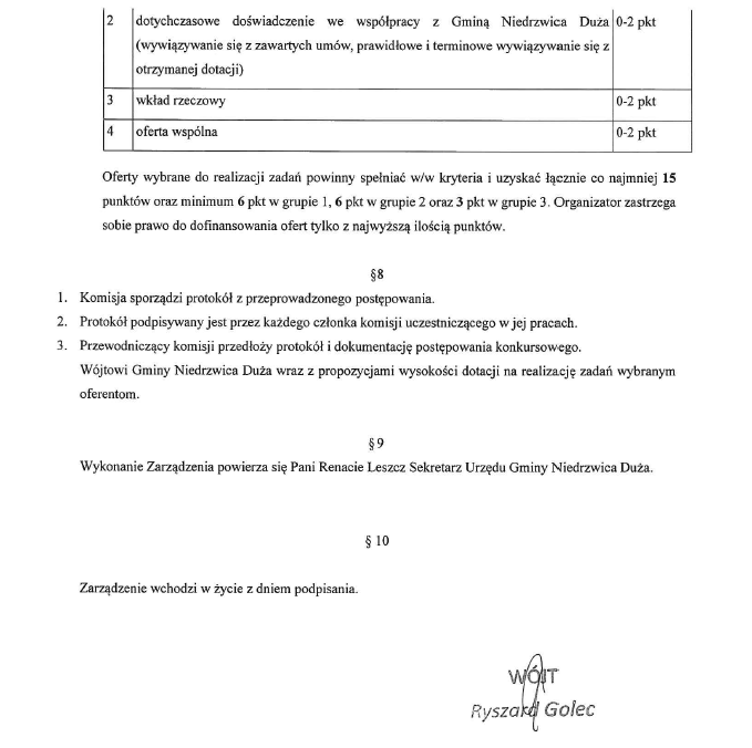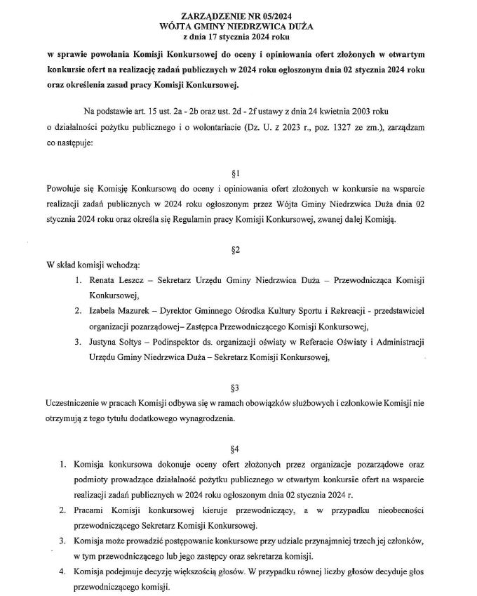 Zarządzenie nr 5/2024 Wójta Gminy Niedrzwica Duża z dnia 17 stycznia 2024 roku w sprawie powołania Komisji Konkursowej do oceny i opiniowania ofert złożonych w otwartym konkursie ofert na realizację zadań publicznych w 2024 rokuArchiwum