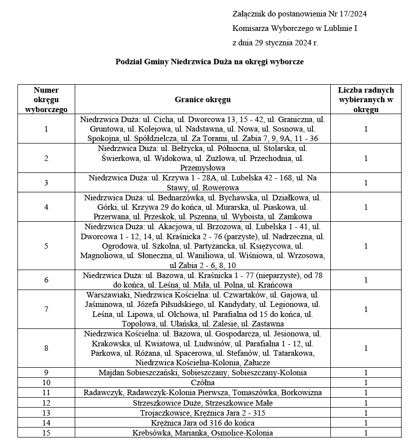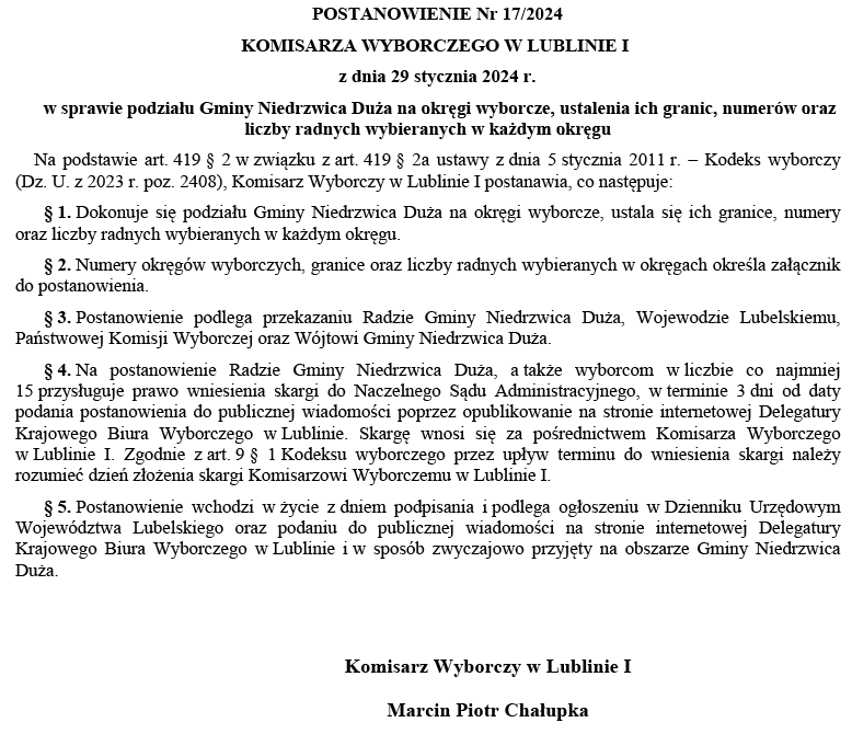Postanowienie Komisarza Wyborczego w Lublinie I w sprawie podziału Gminy Niedrzwica Duża na okręgi wyborcze, ustalenia ich granic, numerów oraz liczby radnych wybieranych w każdym okręguArchiwum
