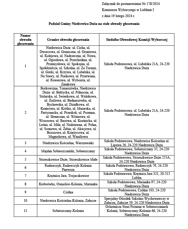 Postanowienie Komisarza Wyborczego w Lublinie I zmieniające postanowienie w sprawie podziału Gminy Niedrzwica Duża na stałe obwody głosowania, ustalenia ich numerów, granic oraz siedzib obwodowych komisji wyborczychArchiwum