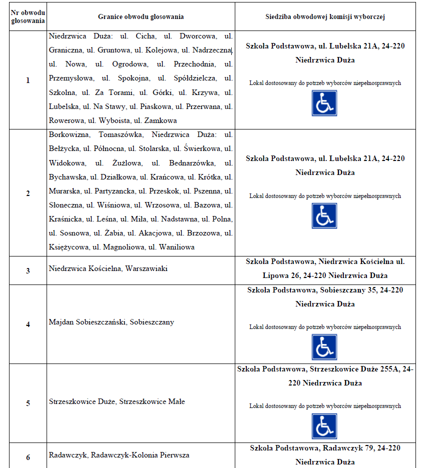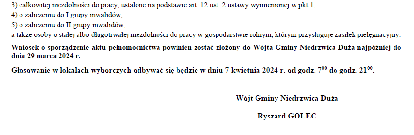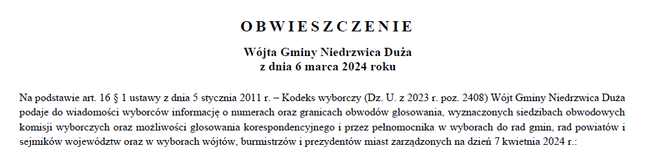 Obwieszczenie Wójta Gminy Niedrzwica Duża o numerach oraz granicach obwodów głosowania w Gminie Niedrzwica Duża w wyborach wójtów, burmistrzów i prezydentów miast zarządzonych na dzień 7 kwietnia 2024 r.Archiwum