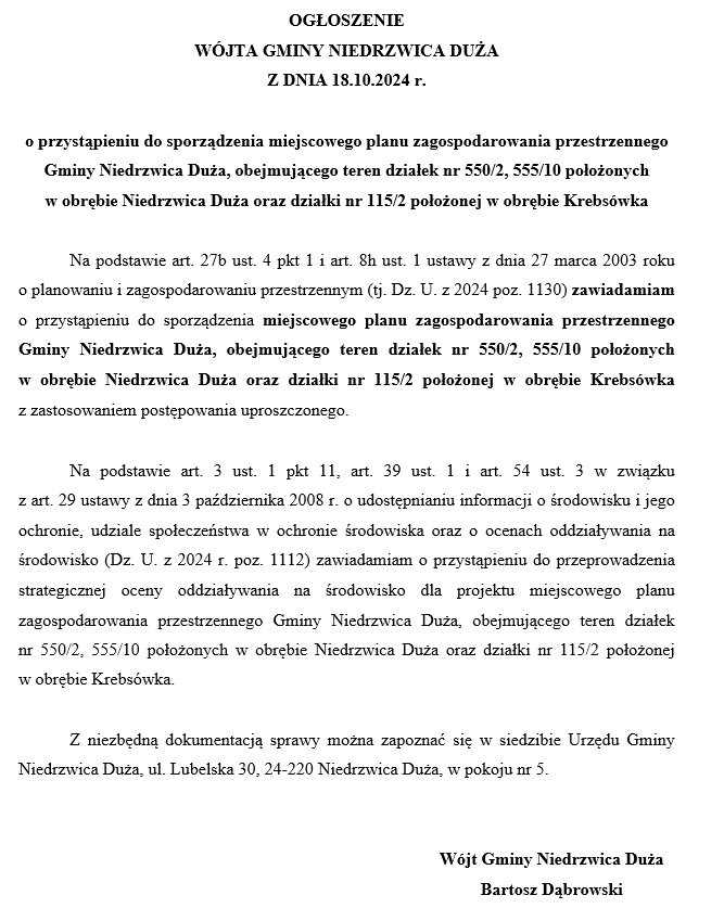 Ogłoszenie o przystąpieniu do sporządzenia miejscowego planu zagospodarowania przestrzennego Gminy Niedrzwica Duża, obejmującego teren działek nr 550/2, 555/10 położonych w obrębie Niedrzwica Duża oraz działki nr 115/2 położonej w obrębie Krebsówka