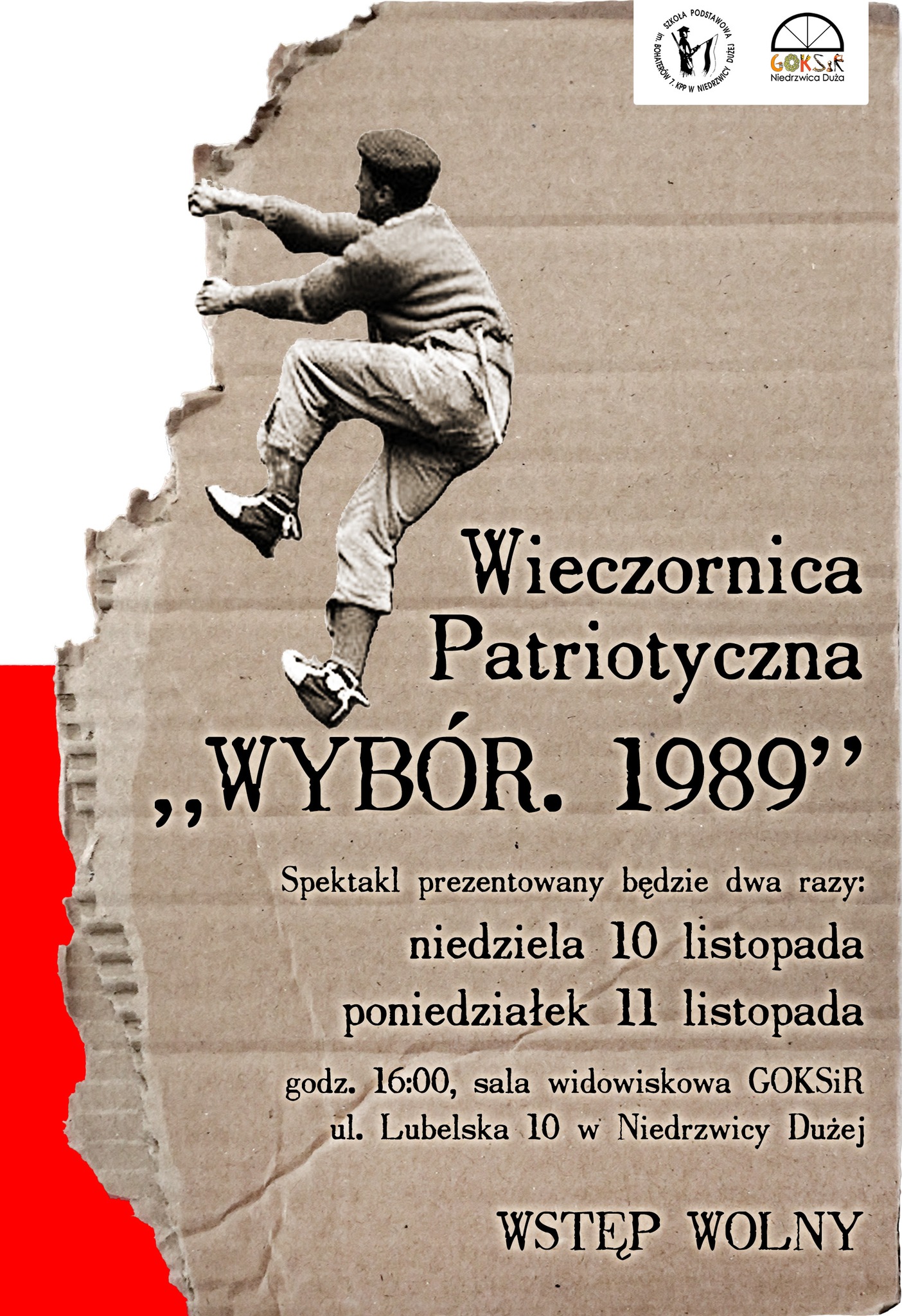 Godz. 16.00 - Wieczornica Patriotyczna pt. „WYBÓR. 1989” w Gminnym Ośrodku Kultury, Sportu i Rekreacji w Niedrzwicy Dużej