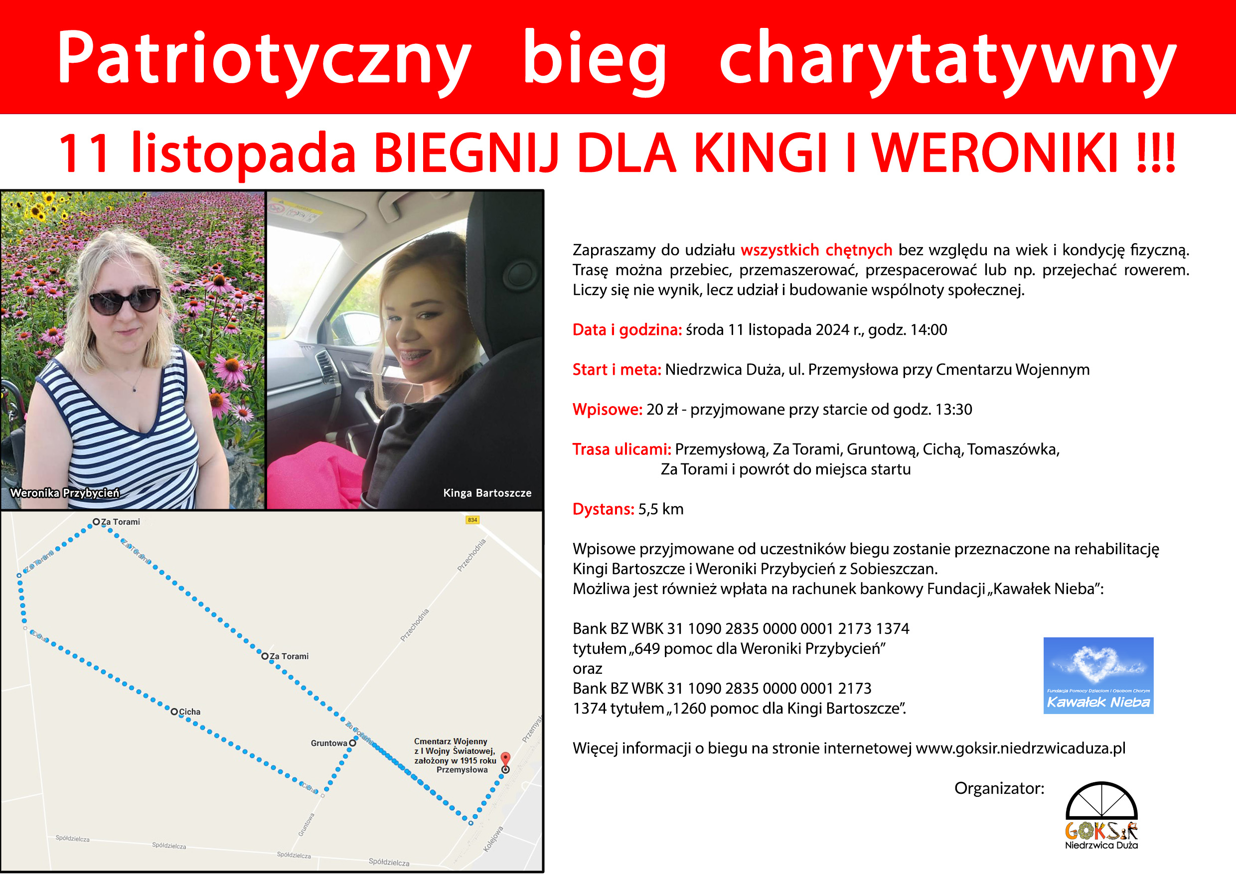 Godz. 14.00 – Patriotyczny Bieg Charytatywny dla Kingi Bartoszcze i Weroniki Przybycień