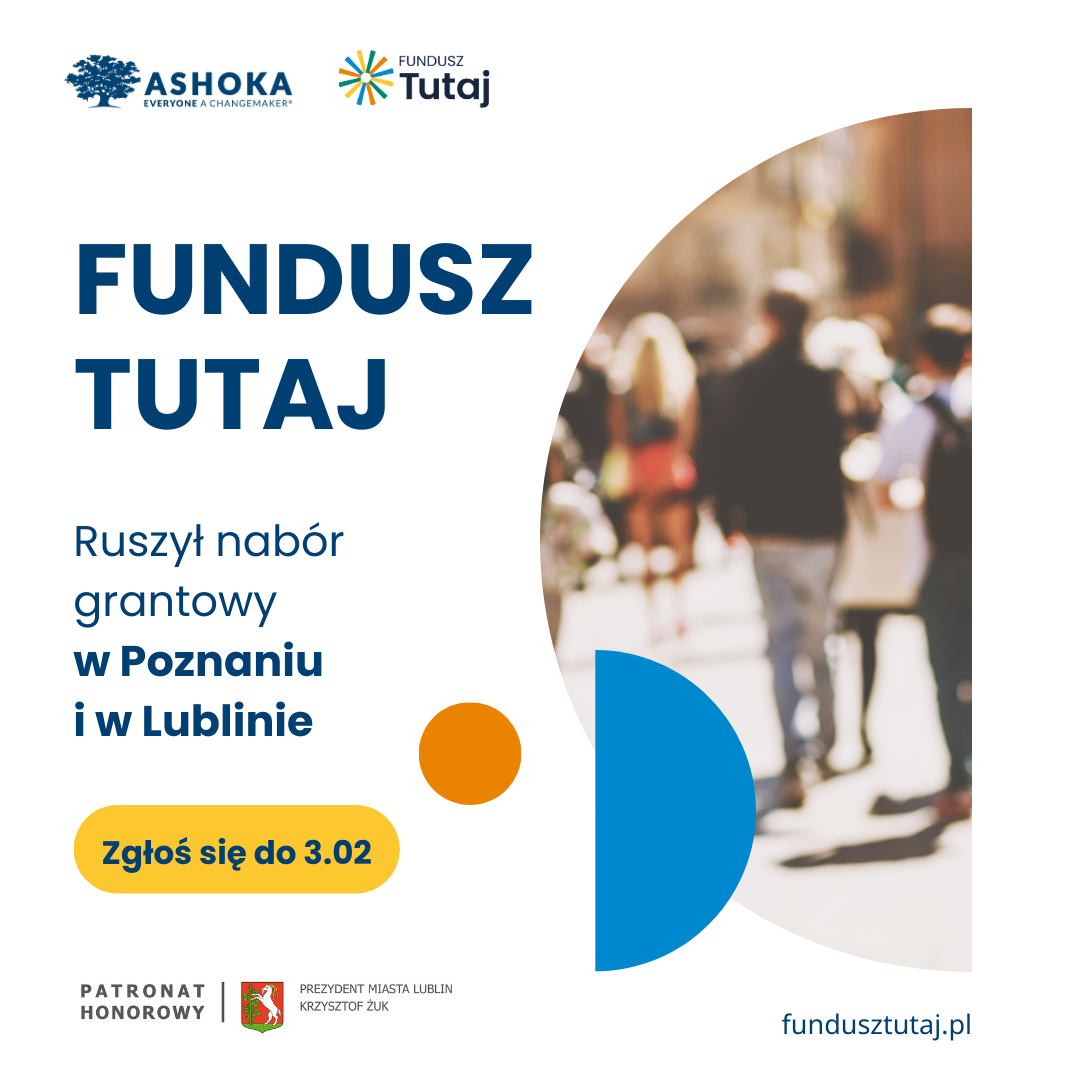 Informujemy, Fundacja Ashoka we współpracy z Miastem Lublin, uruchamia lokalne granty dla organizacji pozarządowych działających na terenie Lubelskiego Obszaru Metropolitarnego.
