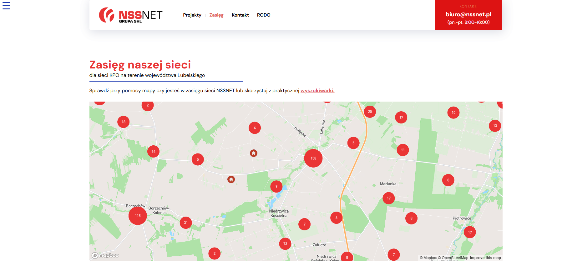 Informacje dot. planowanego zasięgu sieci są zamieszczone na stronie https://nssnet.pl/zasieg/ gdzie każdy zainteresowany udziałem w projekcie może sprawdzić czy jego adres został ujęty w zasięgu sieci NSS NET. Zgłoszenia posesji nieujętych w projekcie należy dokonywać przez stronę inwestora.