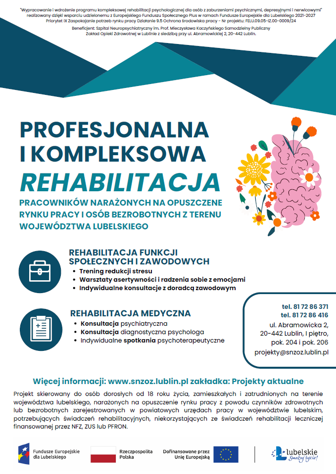 Przedmiotowy projekt jest skierowany do osób dorosłych, zamieszkałych i zatrudnionych na terenie województwa lubelskiego, narażonych na opuszczenie rynku pracy z powodu czynników zdrowotnych oraz do osób bezrobotnych z woj. lubelskiego. Celem programu jest pomoc i wsparcie osób, które zmagają się z długotrwałym stresem związanym z obowiązkami zawodowymi, napięciem psychicznym czy nerwowym w miejscu pracy oraz wypaleniem zawodowym.