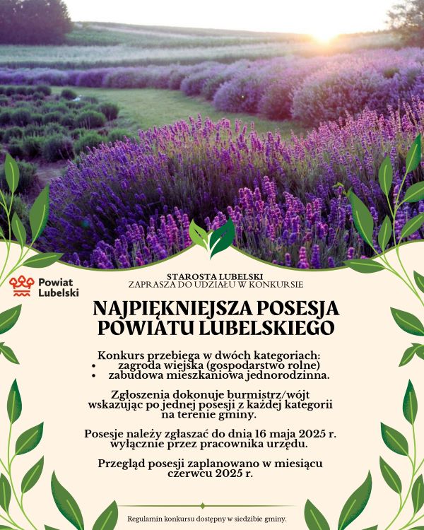 Zapraszamy do udziału w konkursie "Najpiękniejsza Posesja Powiatu Lubelskiego". Organizatorem wydarzenia jest Powiat Lubelski.